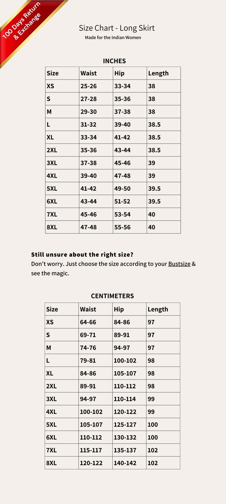 Oh! We hear you. Please click on the size chart above choose your size according to the “bust size” for top wear and “waist size” for bottom wear. Our outfits are true to size. Please don’t worry about the hip size. The patterns have enough flare to fit them well 99% of the times. In other cases, there is a 100-day hassle free “single click” exchange and return available. So don’t hesitate and shop risk free!