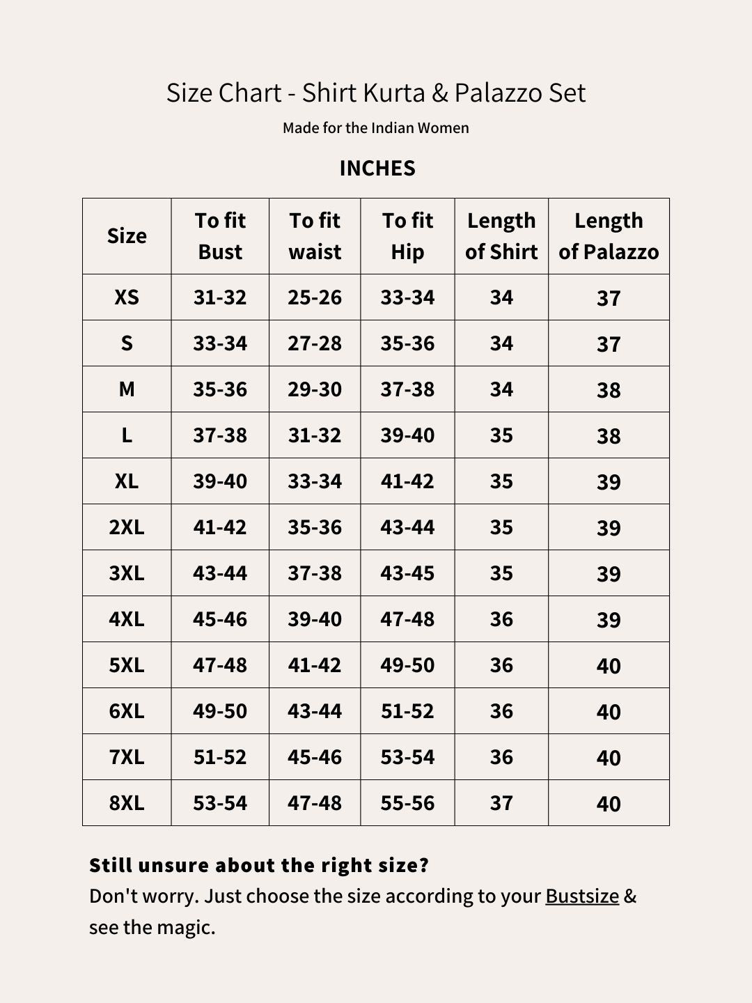 Oh! We hear you. Please click on the size chart above choose your size according to the “bust size” for top wear and “waist size” for bottom wear. Our outfits are true to size. Please don’t worry about the hip size. The patterns have enough flare to fit them well 99% of the times. In other cases, there is a 100-day hassle free “single click” exchange and return available. So don’t hesitate and shop risk free!